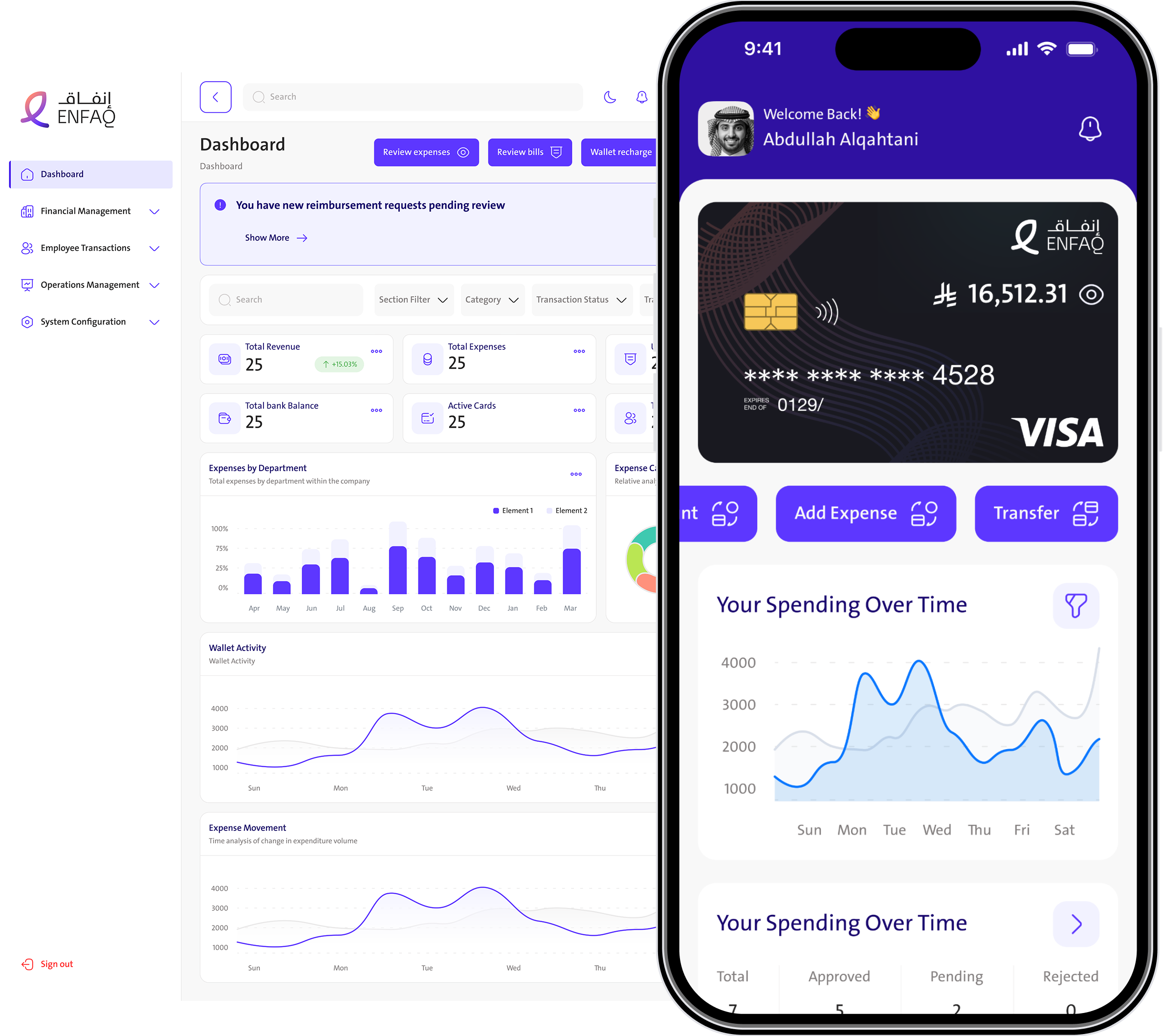 Stay updated with every transaction and manage expenses on the go using Enfaq’s intuitive mobile and web apps.